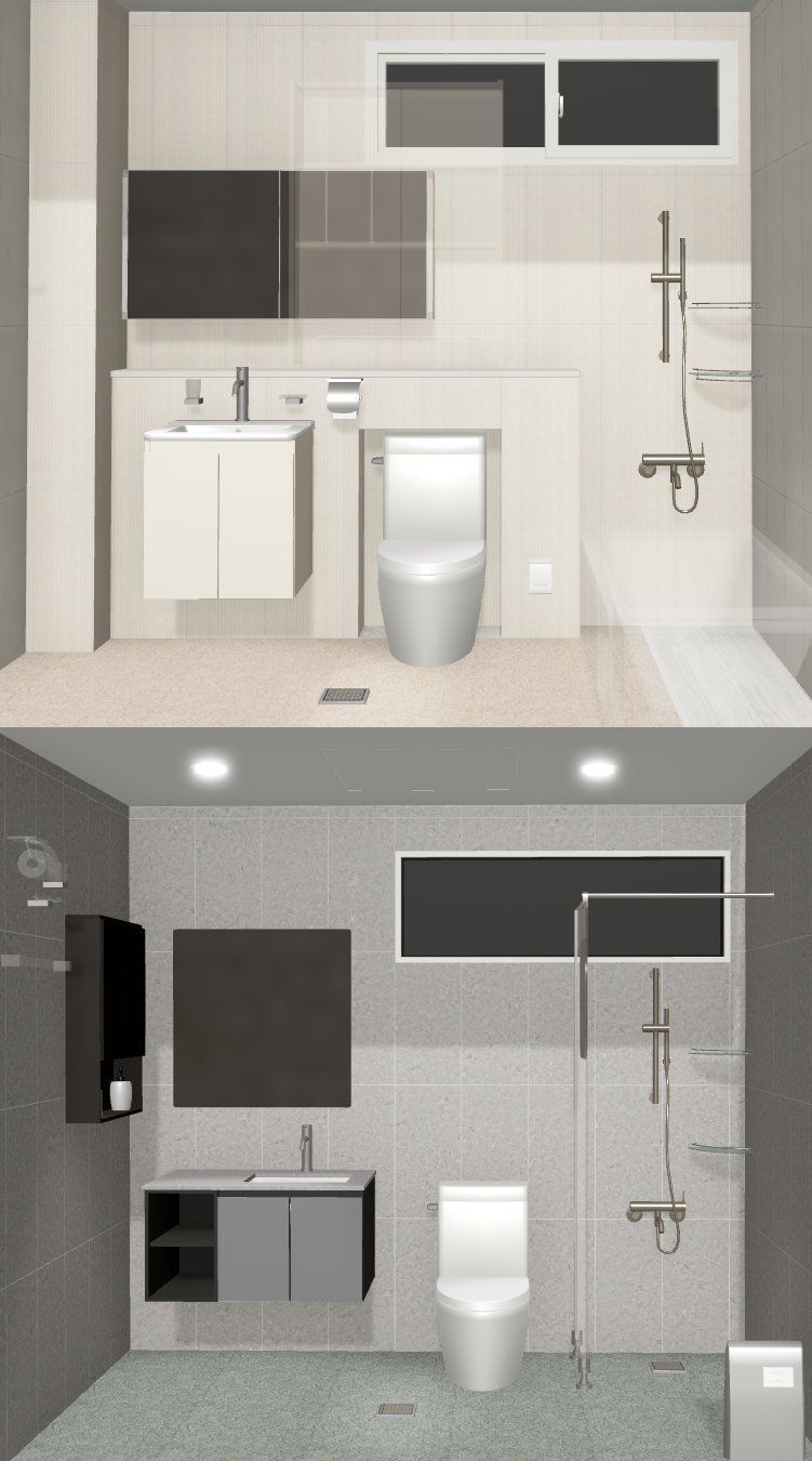 저희집은 욕실이 2개라서 1개는 깔끔한 색상인 베이지톤으로 선택하였고, 2번째 욕실은 좀 더 어두운 그레이톤으로 시공하였습니다.