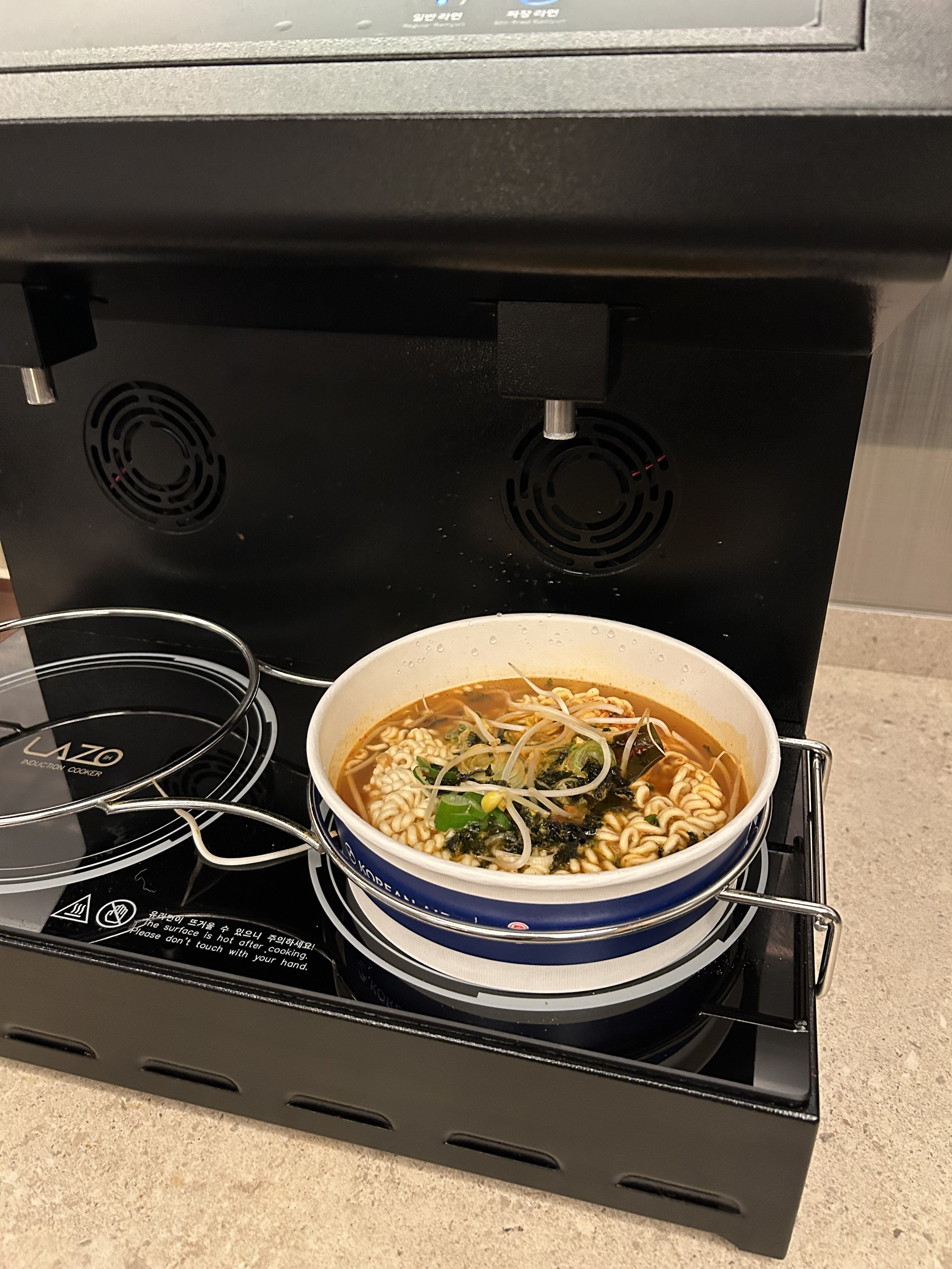 라면을 선택 하고, 한강 라면 기계에서 원하는 토핑을 넣고 라면을 끓이면 끝입니다.