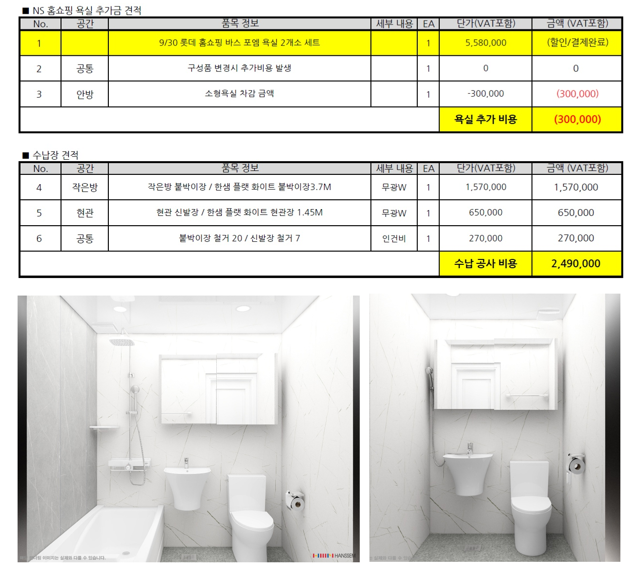 욕실 2개 시공: 5,880,000원 (한* 바스 포엠 욕실 2개)