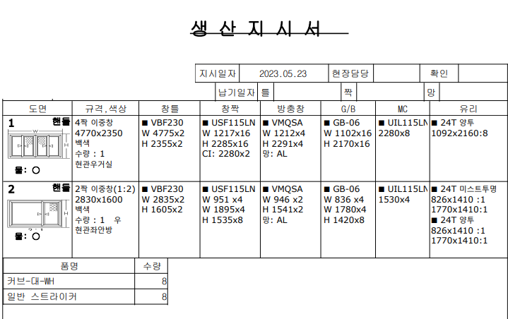 제가 필요한 부분은 거실 큰 창호와 안방 창호였습니다. 이렇게 2가지 사이즈의 창호 견적을 받아보았고, 가장 가격이 비싸 LX창호를 제외한 1군 창호 업체들을 알아보았습니다. 최종 결정하게 된 업체의 견적서는 아래에 확인이 가능합니다.