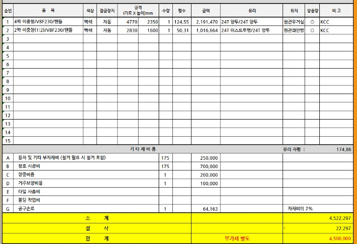 거실 큰 창호와 안방 창호 2가지 총 견적 금액은 부가세 별도로 450만원 입니다. 같은 브랜드 라도 시공하는 업체에 따라서 금액이 조금 달라질 수 있으니, 가급적 여러 업체에 비교견적을 해 보는 것이 좋습니다.
