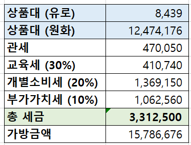 세금 포함하면 15,786,676원으로 한국 백화점에서 사는 금액보다 더 비싸네요 ㅜㅜ